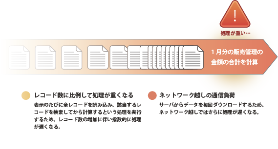 特にレコード数が増えると、従来型の集計方式ではパフォーマンス低下が起きやすくなります。これは販売管理・工事管理・受注管理など、日々レコードが大量に増える業務では特に顕著で、業務効率に直接影響する大きな課題です。