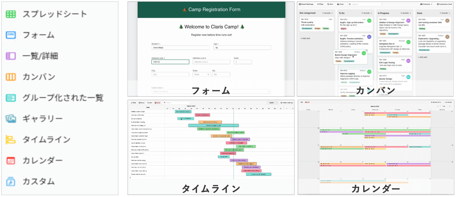 上図のピンク枠のことで、データを表示・操作するためのインターフェースを「ビュー」と呼びます。Claris Studio には、あらかじめ設定されたビューの種類が複数用意されています。