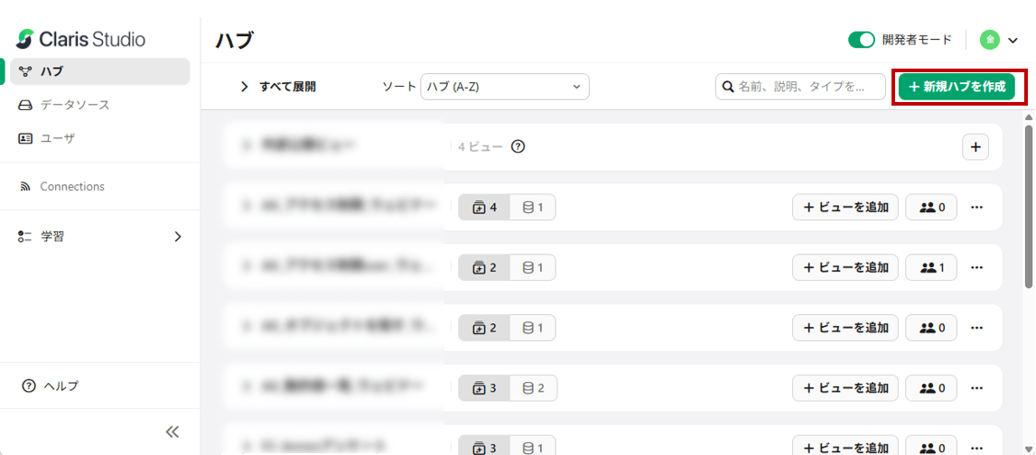 ハブは、画面右上の [新規ハブを作成] から作成できます。