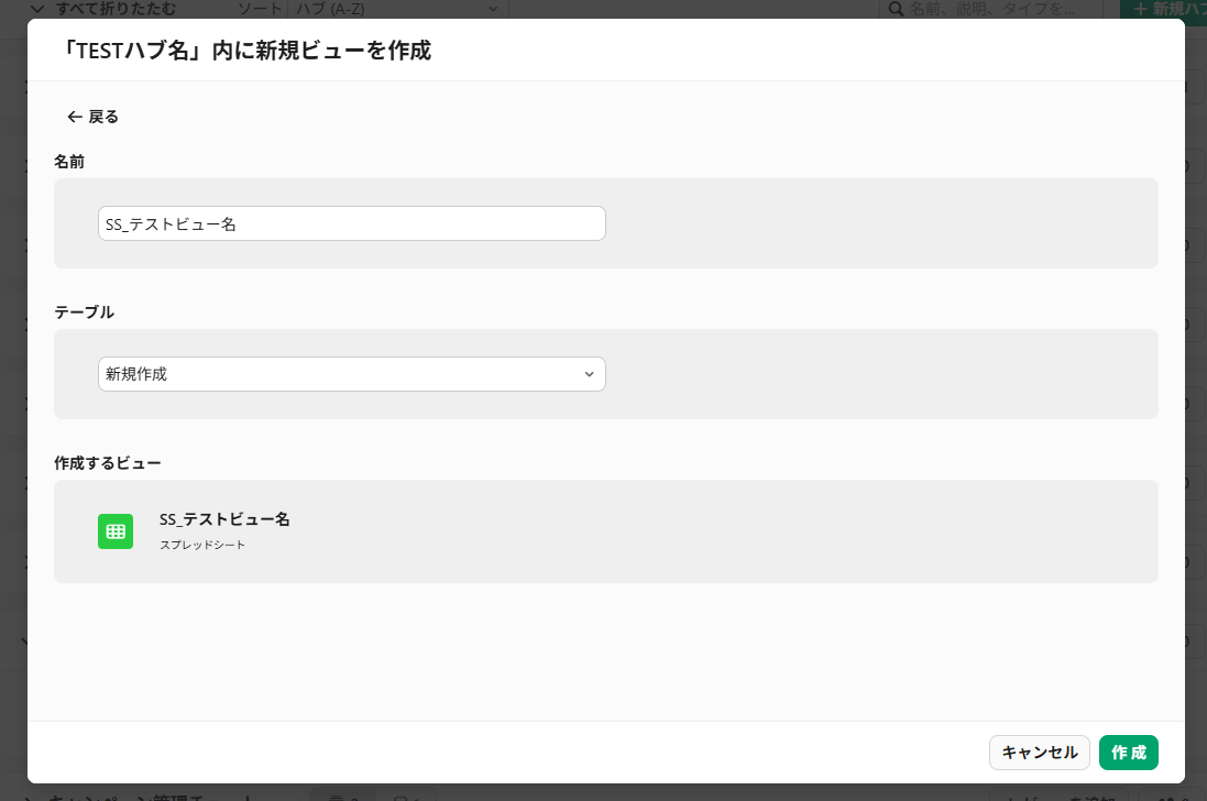 ビューの種類を選択し、ビューの名前とテーブルを指定することで、新規ビューを作成できます。