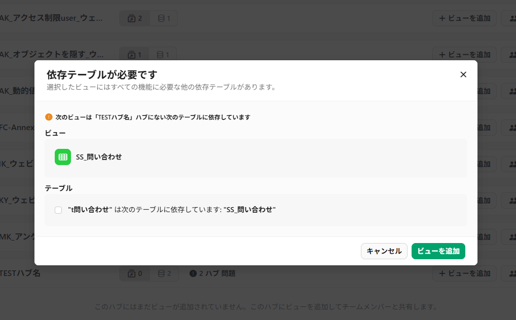 ※ビューを追加する際、依存テーブルに関する確認画面が表示されます。
