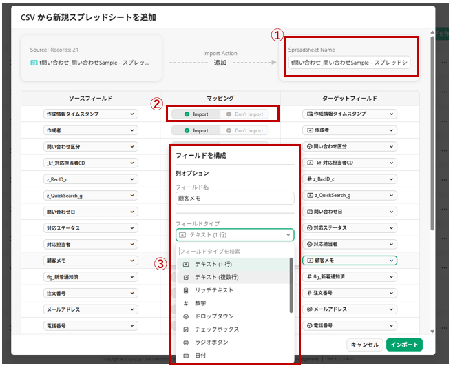 フィールドタイプはインポート後に変更できないため、特に注意が必要です。