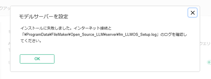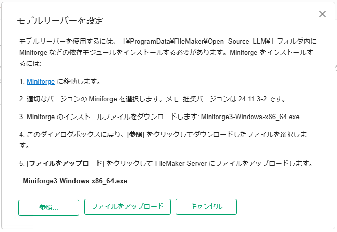 FileMaker Server インストール後、AIサービスを設定しようと、 Miniforge をアップロードすると、セットアップが途中で失敗してしまいした。画面には、次のようなメッセージが表示されました。