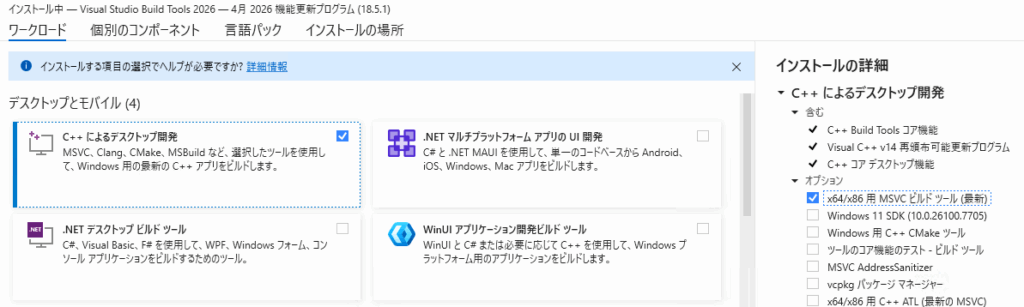 オプションとして x64/x86 用MVSCビルドツール(最新)を追加しインストールをおこないます。